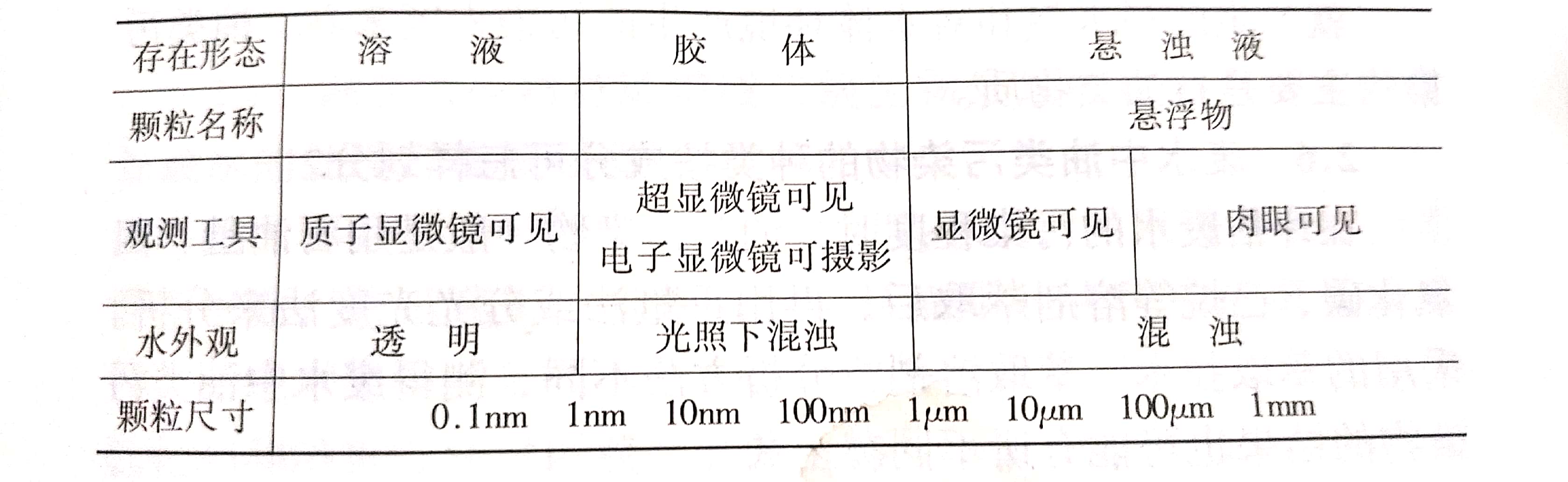 廢水中雜質顆粒按存在形態可以分為懸浮物質、膠體物質和溶解性物質等三種,其具體分散狀態和尺寸見下圖: